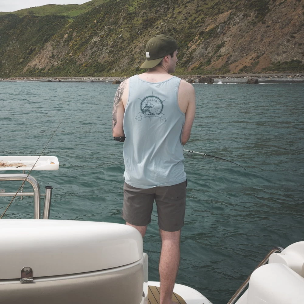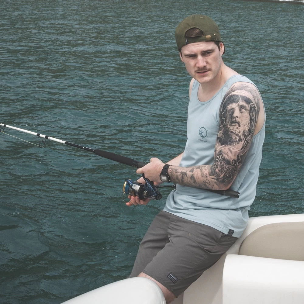 The Desolve Compass UPF50 Mens Singlet provides optimum sun protection, and is made of cotton-spandex blend for comfort and stretch. Built for 100% legit salty sea dogs and fish harassing enthusiasts.